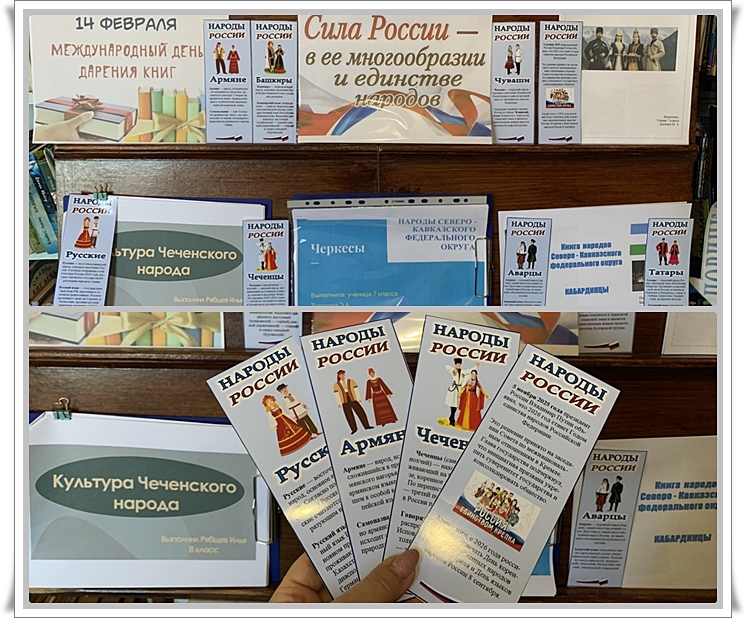 В Международный день книгодарения библиотека завершила необычный проект. В Год единства народов России заведующая предложила юным читателям создать книги о народах Северо-Кавказского федерального округа. Ребята собрали информацию об истории, традициях, национальной кухне, культуре и легендах. В итоге получились уникальные издания, которые объединили на выставке. Экспозицию дополнили закладки «Народы России», посвященные разным этносам страны. Детское творчество стало настоящим подарком к празднику. Библиотека получила 5 изданий, созданных юными авторами.