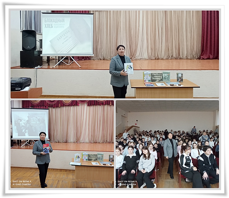 Библиотека организовала урок мужества и акцию «Блокадный хлеб». Школьники погрузились в историю 872-дневной блокады, узнали, как Ленинград выстоял, окруженный врагом и лишенный продовольствия. Сотрудники библиотеки рассказали, что дети наравне со взрослыми боролись с голодом и холодом: работали на заводах вместо ушедших на фронт родителей, строили укрепления, дежурили на крышах, тушили зажигательные бомбы. Особенно впечатлил школьников рассказ о блокадном хлебе. Ребята узнали о «Дороге жизни» и военных инженерах М.С. Дмитриеве и И.И. Смирнове, которые первыми 17 ноября 1941 года проехали по тонкому льду Ладожского озера. Важным моментом урока стал рассказ о дневнике Тани Савичевой — горьком свидетельстве трагедии. В конце мероприятия библиотекарь рекомендовала книги о блокаде. Урок помог школьникам лучше понять подвиг ленинградцев, почувствовать связь с прошлым и осознать цену Победы.
