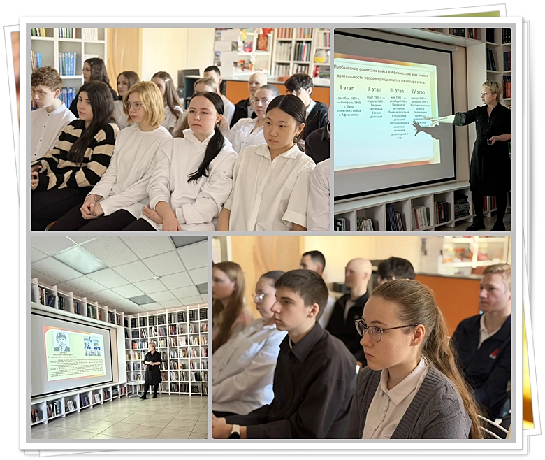 В библиотеке прошел час мужества, приуроченный к памятной дате — Дню вывода советских войск из Афганистана. Встреча была посвящена нашим землякам и всем солдатам, которые с доблестью исполняли интернациональный долг в далекой стране. Ребятам рассказали о непростых причинах начала Афганской кампании и тех экстремальных условиях, в которых приходилось выживать и воевать нашим бойцам. В ходе мероприятия был сделан акцент на беспримерном героизме и верности присяге советских военнослужащих. Особенно трогательным стал рассказ о нашем прославленном земляке — Василии Зайцеве, Герое Афганистана, в честь которого названа улица в городе. Этот час мужества стал искренней данью памяти и уважения всем, кто прошел суровые испытания Афганской войной.