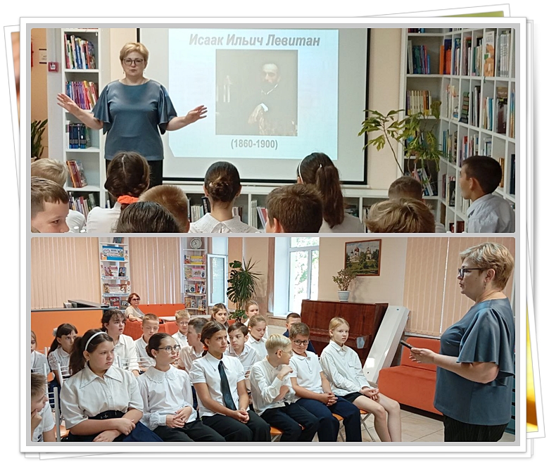 В рамках проекта «Культура для школьников» библиотека организовала мероприятие, посвящённое творчеству Исаака Ильича Левитана. Художник, чьё искусство наполнено любовью к русской природе, трогает сердца зрителей. Преподаватель изобразительного искусства из школы № 1, Е.В. Ткачук, увлекательно рассказала школьникам о знаменитых картинах Левитана. Встреча завершилась показом видеофильма о его творчестве. Этот фильм погрузил ребят в мир поэтичных и прекрасных полотен мастера.